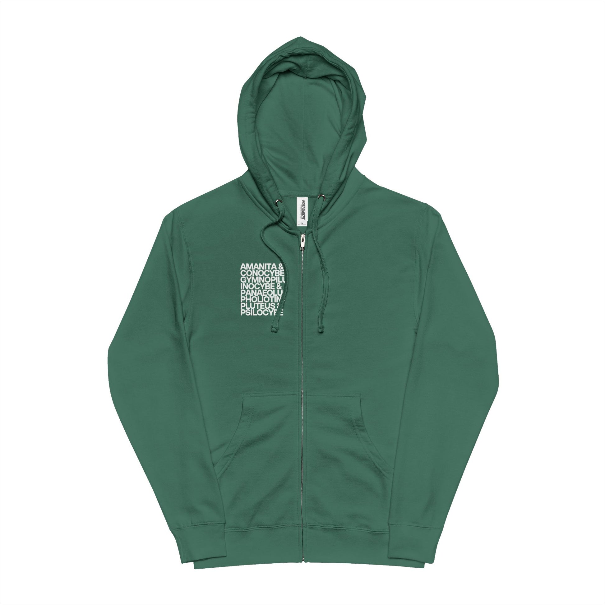 A soft, steady layer for cooler days, this midweight fleece zip-up carries a subtle nod to the entheogenic world. The front graphic lists well-known psychoactive mushroom genera in a clean, stacked typography—minimal, studious, and intentionally understated. It reads less like merch and more like a quiet badge for those who know the field.