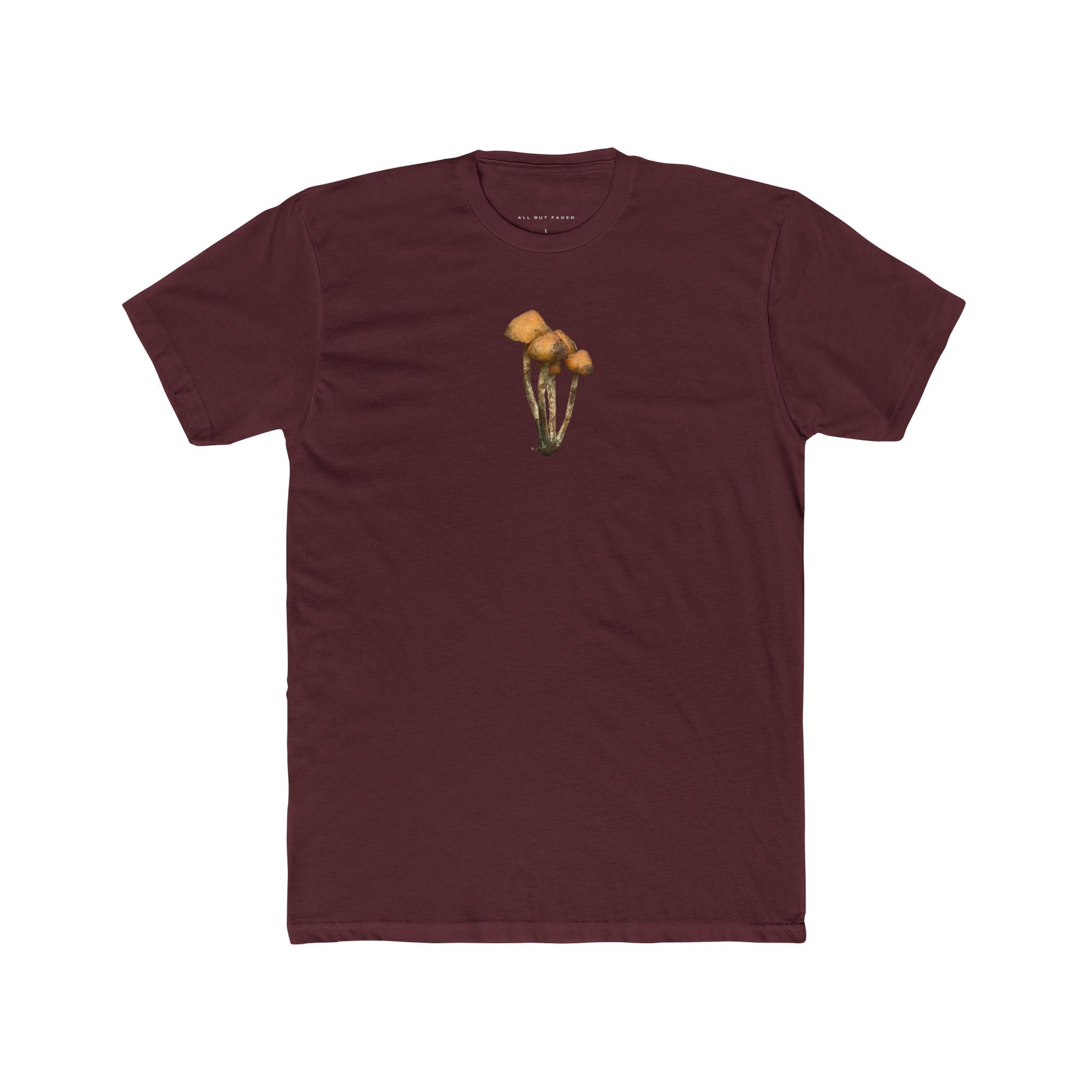 Quiet and deliberate, this crew tee carries a small field photograph of Psilocybe zapotecorum at chest level — a study in earthy gold caps, slender stems, and the subtle blues and greens you only see in wild specimens. The image feels like a page torn from a botanist’s notebook, intimate and restrained rather than loud. Wear it under a flannel on foggy mornings, as a breathable base layer for long trail days, or folded into an evening pack for campsite conversations. The fitted, lightweight Next Level tee drapes close to the body, letting the tiny cluster sit like a secret shared between the wearer and the landscape that raised it. For people who read the world in textures, light, and quiet colors, this shirt is a soft, steady companion.